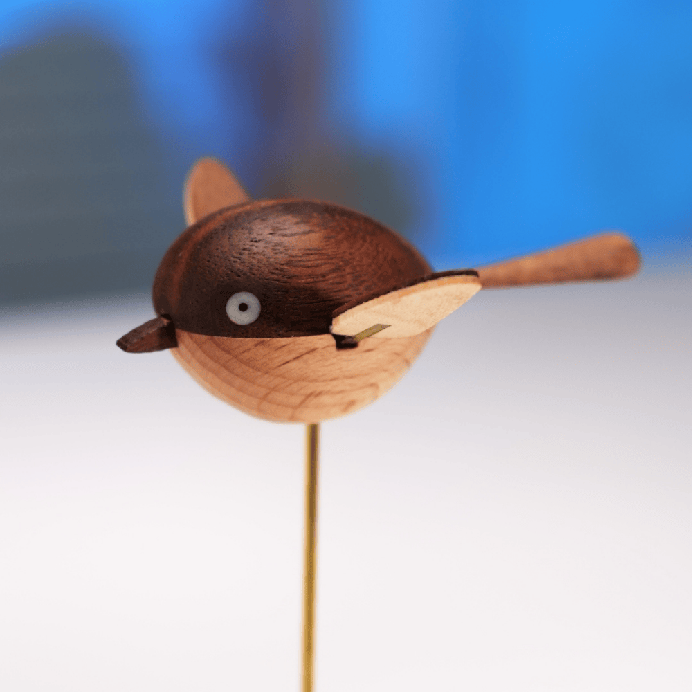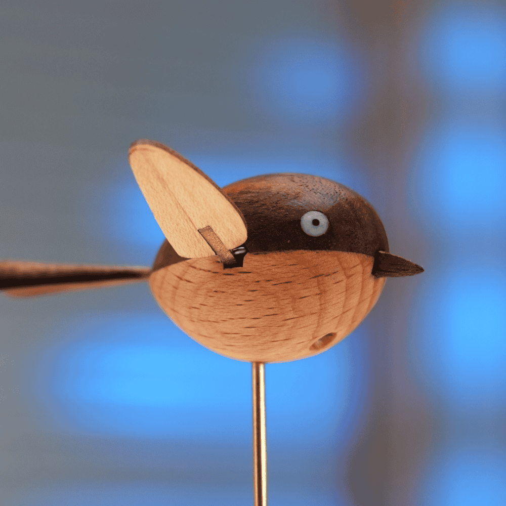 This handcrafted walnut bird switches between three adjustable wing speeds—slow and gentle, natural and lively, fast and playful.
